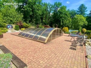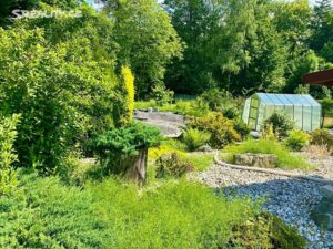 Zahrada je udržovaná s vzrostlými stromy, květinami, zahradním jezírkem, skalkou, bazén s protiproudem, lehátky, hřiště pro děti a posezení u krbu